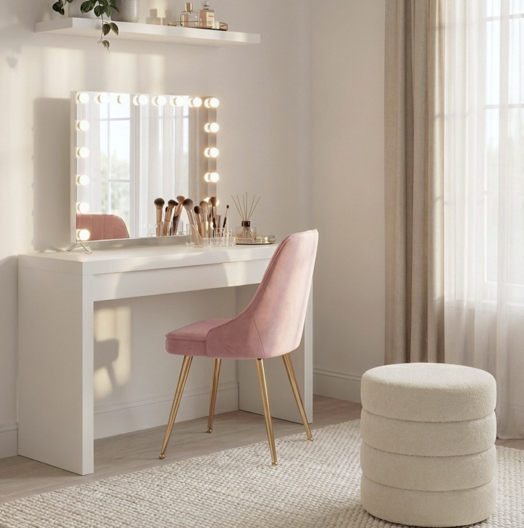Elevate your routine with our Hollywood Glam Make-up Mirror, featuring 18 LED bulbs to light up your space. The sturdy, lightweight metal frame adds a touch of glamour, while the powder-coated MDF base ensures stability. Easily adjust the LED brightness and colour temperature (cool white, daylight, or warm yellow) with touch controls. Transform your space into a VIP set and enjoy your beauty in perfect light.