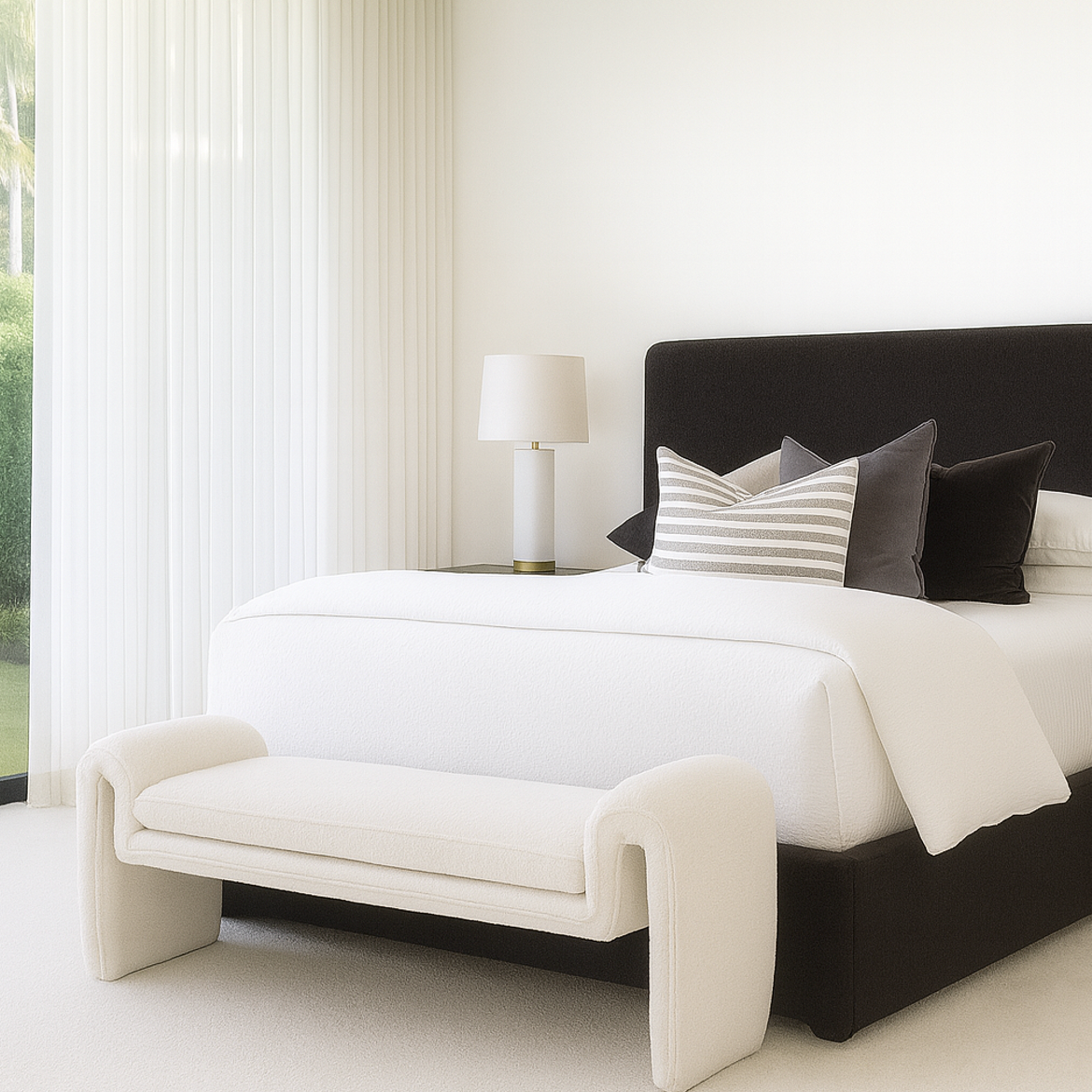 The Solace Bench, upholstered in luxurious boucle, adds timeless elegance to any space. Its plush texture invites comfort while the minimalist design ensures versatility, making it an ideal accent piece for bedrooms, living rooms, or entryways. Elevate your interior with this sophisticated blend of style and function.